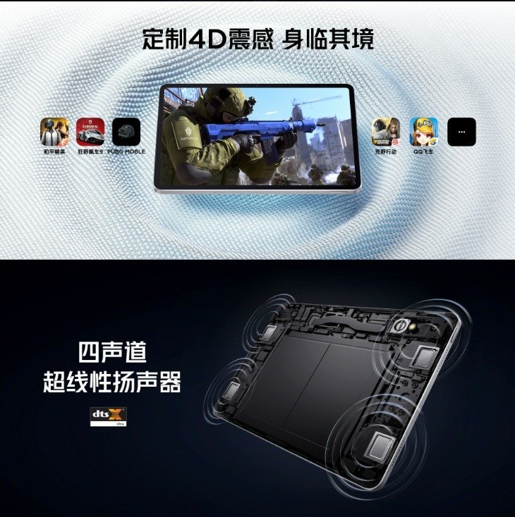 至于其他配置方面,红魔电竞平板 Pro 还搭载了 10100mAh 的大电池,支持 120W 快充;它内置了双 X 轴线性马达,振动反馈相当到位;它还有四声道超线性扬声器和双阵列降噪麦克风,并且有游戏专属麦克风,方便游戏中的沟通。