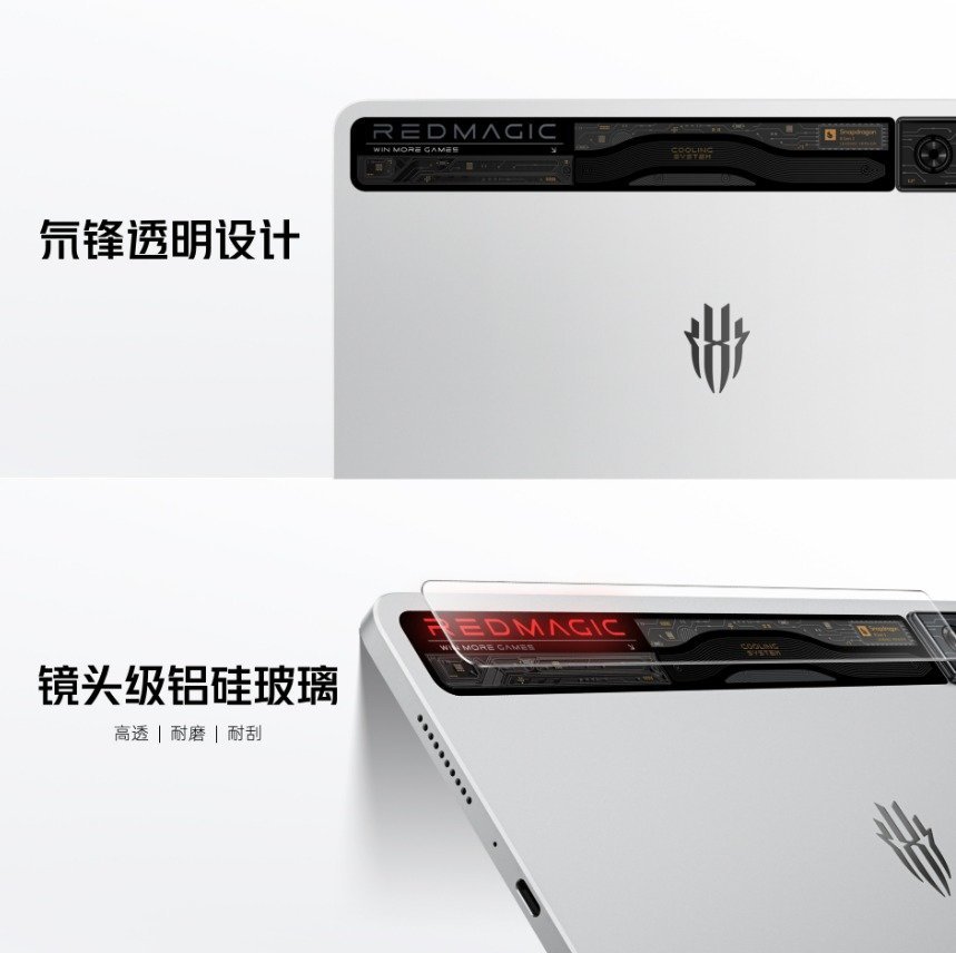 在外观上,红魔电竞平板 Pro 采用了比较独特的氘锋透明设计,后盖几乎完全采用金属一体化机身,还在机身后盖上采用了一个透明窗口,展现了机身内部的部分结构,并且内置风扇和 Logo 的显示效果也更加突出,彰显了它的电竞平板身份。