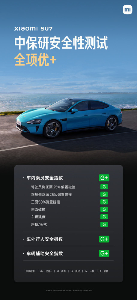 此前,中保研依据中国保险汽车安全指2023版规程对小米SU7进行了评测。测评结果显示,小米SU7耐撞性与维修经济性分指数获得良好评价。驾驶员侧25%偏置碰撞工况、正面50%偏置碰撞工况以及侧面碰撞工况中,小米SU7的测评结果均为0缺陷,因此其获得了最高的G+评分。车辆在车内乘员、车外行人和辅助安全方面均取得了G+的最好成绩,而在耐撞性与维修经济性上也获得了A的评分。