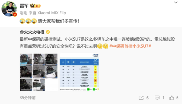 该网友发文称:“最新中保研的碰撞测试,小米SU7是这么多辆车之中唯一连玻璃都没碎的。雷总貌似没有重点营销过SU7的安全性吧?说不过去啊。”没想到这一微博被雷军给转发了,并且写道:“请大家帮我们多宣传!”看来,雷总再一次在微博求网友转发。