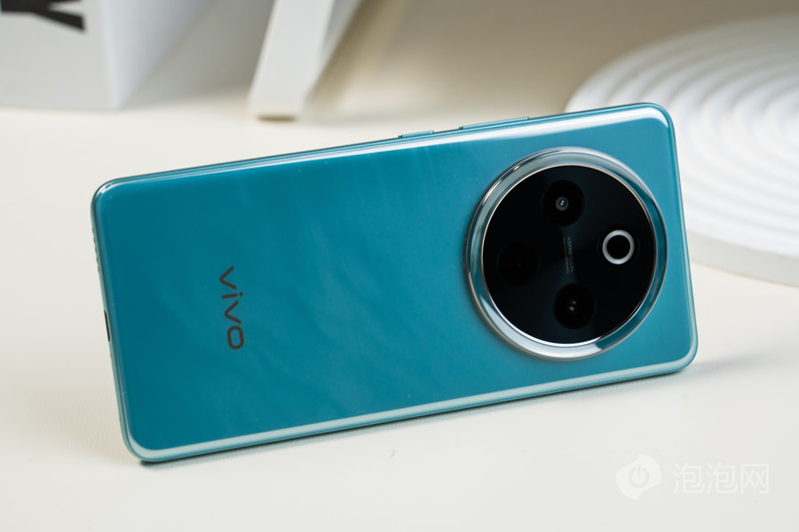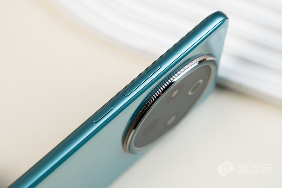 青绿色的后盖搭配内部的纹理呈现出翡翠般的质感,搭配亮面设计看起来十分通透。这款手机采用了高端机型常见的居中圆形后摄模组,被称作“万镜织光阵列”,凸起的装饰环与后盖有着相同的质感,外侧还有一圈淡金色的保护圈点缀,在光照下就像一个精致的环形玉佩,模组内部的三颗镜头与环形闪光灯也采用了对称排布,带来了一种协调美感。