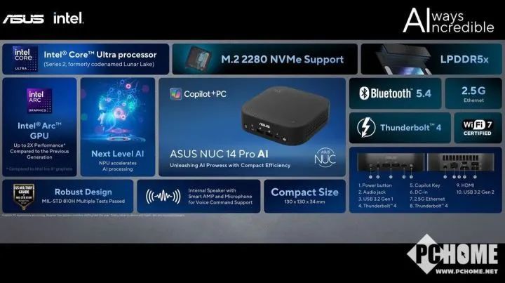 全新的NUC 14 Pro AI搭载了刚刚发布的全新酷睿Ultra 200V“Lunar Lake”系列处理器,8核心8线程设计,采用全新的代号Battlemage的Xe2架构核显,并有最新的第四代NPU,可单独提供48 TOPS的AI算力,内存直接封装在CPU上以节省空间,支持LPDDR5x-8533内存。存储方面配备双M.2插槽,从介绍来看应该是2230+2280 SSD规格配置。连接方面支持WiFi 7和蓝牙5.4,并配有1个2.5G网口。