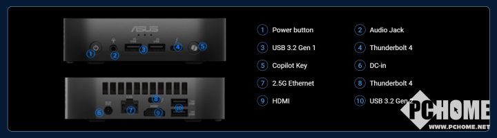 全新的NUC 14 Pro AI在外观上也有着一定的变化,整体尺寸为130×130×44mm,纯黑外观设计,顶部面板采用点阵装饰,左上角有“NUC”字样标识。机身正面除了开机键外,还增加了Copilot按键,可以一键唤起Windows内置AI功能。接口方面,NUC 14 Pro AI除网口外正面还拥有两个USB-A端口和一个USB-C端口。背面还有两个USB-A 端口、一个HDMI端口和一个雷电4端口。