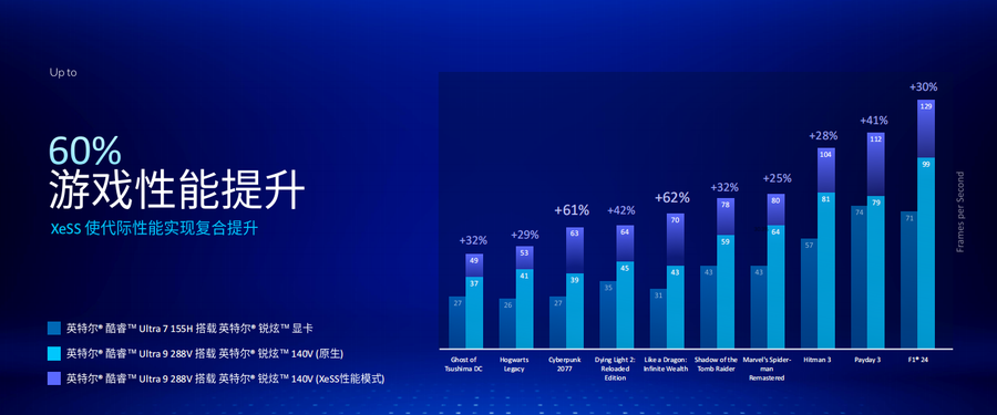 英特尔酷睿Ultra 200V系列处理器的的核芯显卡在XeSS技术的助力下,在众多游戏当中均能够实现大幅的性能提升。