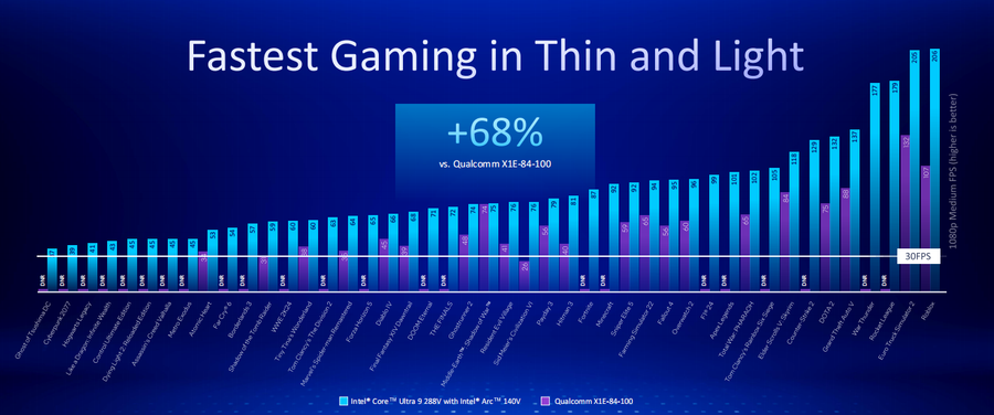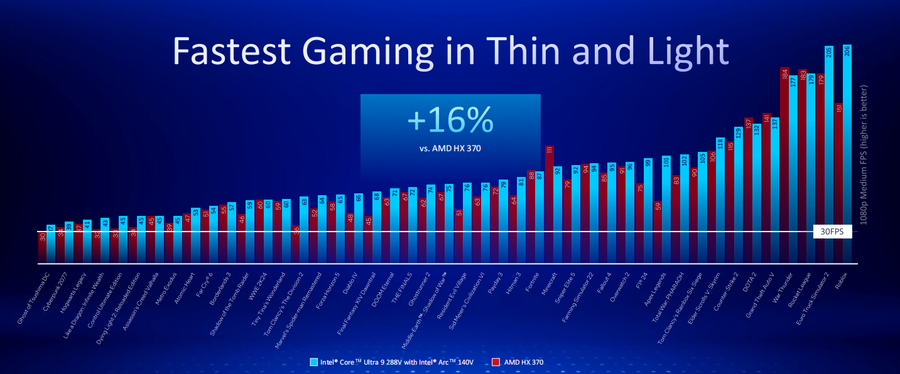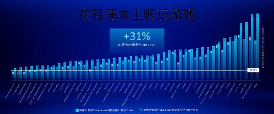 对比AMD新一代移动处理器的集成显卡,英特尔酷睿Ultra 200V系列处理器的核芯显卡在大量游戏当中表现也要更优。