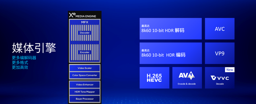 Xe 2 GPU架构此次还拥有全新的媒体和显示引擎。其中在媒体引擎部分,不仅支持AV1编解码,而且还支持VVC解码。