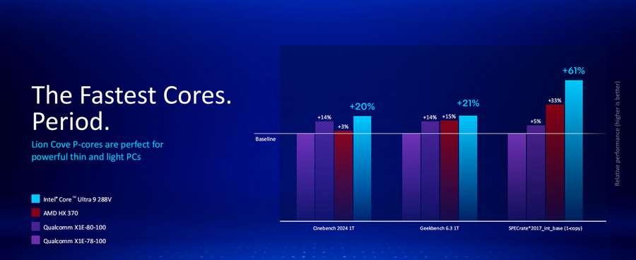 对比同时代竞品,英特尔酷睿Ultra 200V系列处理器性能核的单核心性能,同样领先。