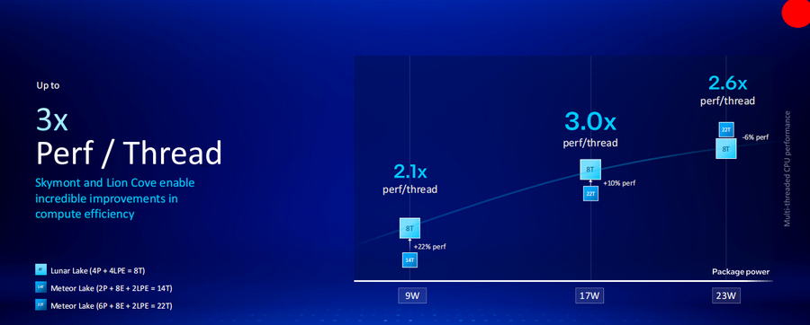 整的能耗表现,英特尔酷睿Ultra 200V系列处理器也相当出色,在17W功耗下,英特尔酷睿Ultra 200V系列处理器相比6+8+2核心22线程的Meteor Lake架构处理器,平均线程性能大约是后者的3倍之多。