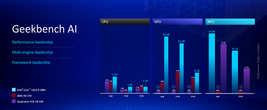在Geekbench AI测试中,英特尔酷睿Ultra 200V系列处理器的AI性能也要领先于AMD和高通的同级别处理器。