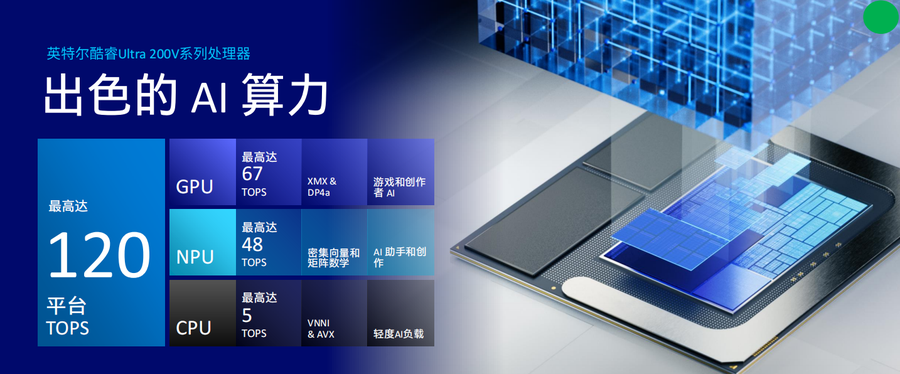 英特尔酷睿Ultra 200V系列处理器的CPU AI算力高达5 TOPS,GPU算力高达67 TOPS,NPU算力高达48 TOPS。总平台算力突破100 TOPS,这对于主要面向超轻薄移动PC平台的处理器来说,已很强大。