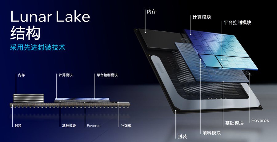 英特尔酷睿Ultra 200V系列处理器(Lunar Lake架构处理器),主要由计算模块、平台控制模组这2大部分构成。如果算上内存的话,也才3大部分。