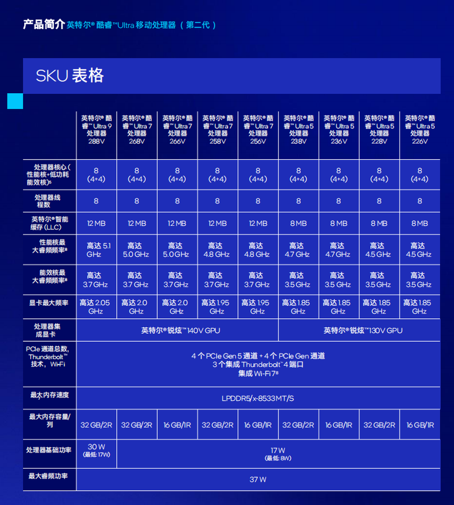 旗舰产品为酷睿Ultra 9 288V,其采用4+4核心8线程设计,至高睿频可达5.1GHz,内建锐炫140V核芯显卡,内建32GB LPDDR5x-8533MHz内存。
