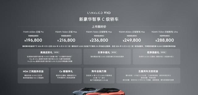 2024年9月5日,定位新豪华智享旗舰轿车的领克Z10正式宣布上市,新车共有5款车型,官方指导价20.28-29.98万元。即日起至2024年10月31日,支付5000元下订领克Z10并锁单,且在2024年12月31日前完成交车,还可以享受上市限时价19.68-28.88万元。此外,还能尊享高端进阶礼、乐享补能礼、悦享焕新礼、NOA订阅服务权益、Co客臻享礼、购车金融方案、五重用车无忧权益。