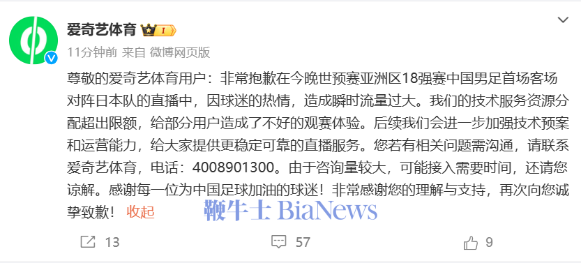 爱奇艺体育称,“在今晚世预赛亚洲区18强赛中国男足首场客场对阵日本队的直播中,因球迷的热情,造成瞬时流量过大。技术服务资源分配超出限额,后续我们会进一步加强技术预案和运营能力,给大家提供更稳定可靠的直播服务。”