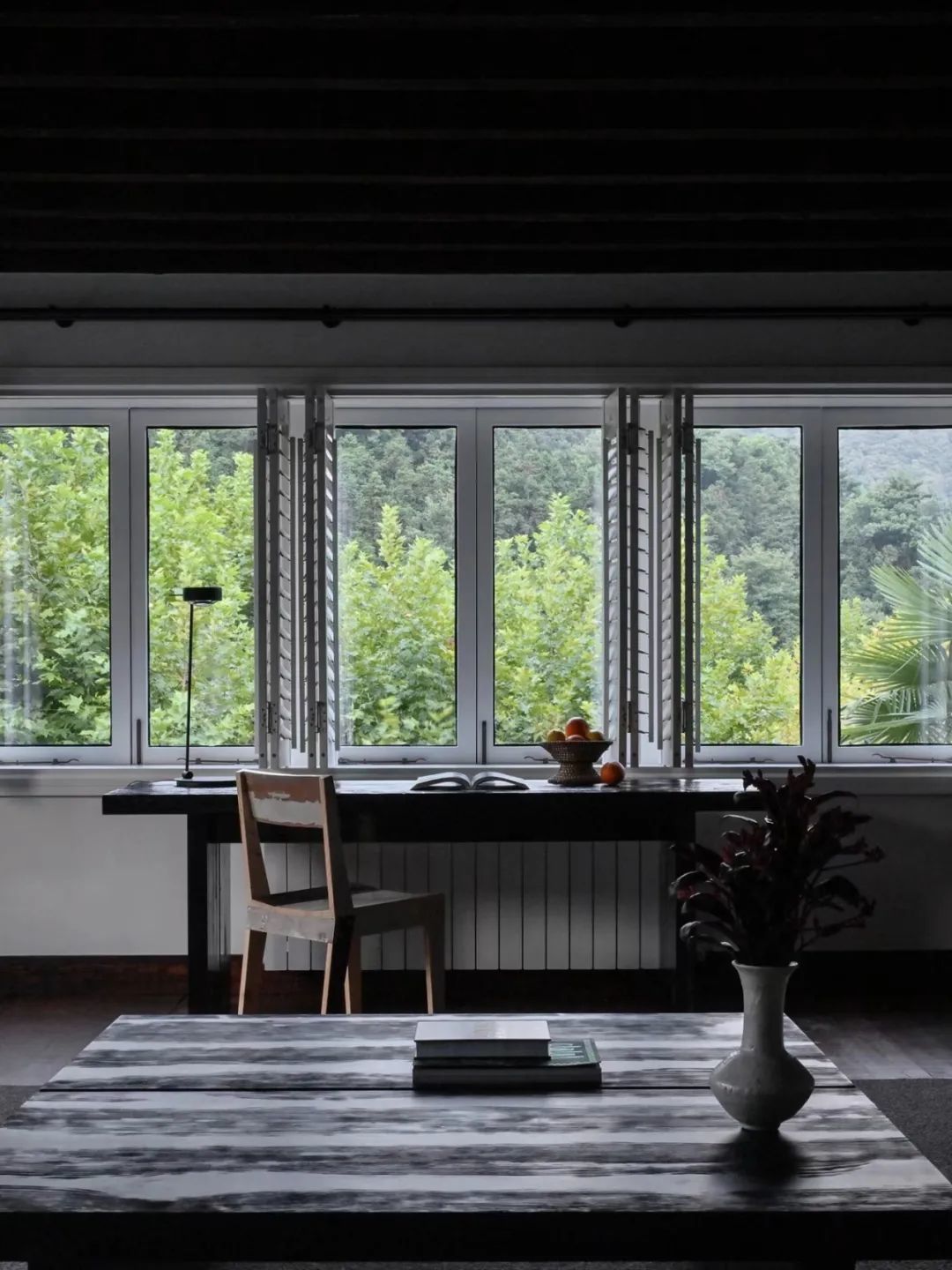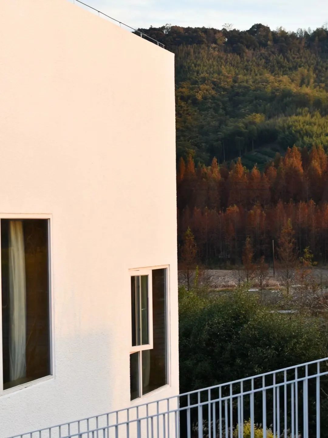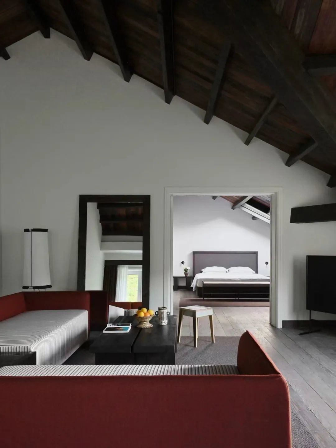 如果说莫村旅馆的话,或许是继承了法国山居与地形和周边自然相互呼应的建筑形态,站在远处眺望,建筑与周边环境完美融合,形态随地势起伏,白与黑的外立色像是山水画中的一点水墨,整个建筑更像是在山中生长而出,而不是外来者的强行闯入。柚木的家居、兼具功能性与美学性的布料选择,顺畅连接室内外空间,构筑了一个与自然共鸣的有机整体。