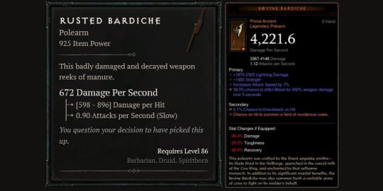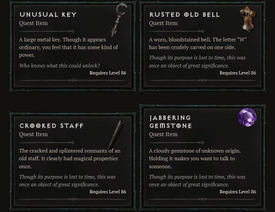 其中有一件物品名为 “生锈的戟斧(the Rusted Bardiche)”,戟斧是《暗黑 2》中奶牛关敌人使用的武器,而且在《暗黑 3》中,将武器 “牛王戟斧” 放进卡奈魔方正是打开 “不是奶牛关” 的方法。此外,数据挖掘还找到了 4 件特殊物品,分别是 “不寻常的钥匙”、“生锈的老钟”、“喋喋不休的宝石” 以及 “弯曲的法杖”。除了钥匙,其他物品似乎都与《暗黑 3》中用于开启 “小马关” 的三件道具一一对应。