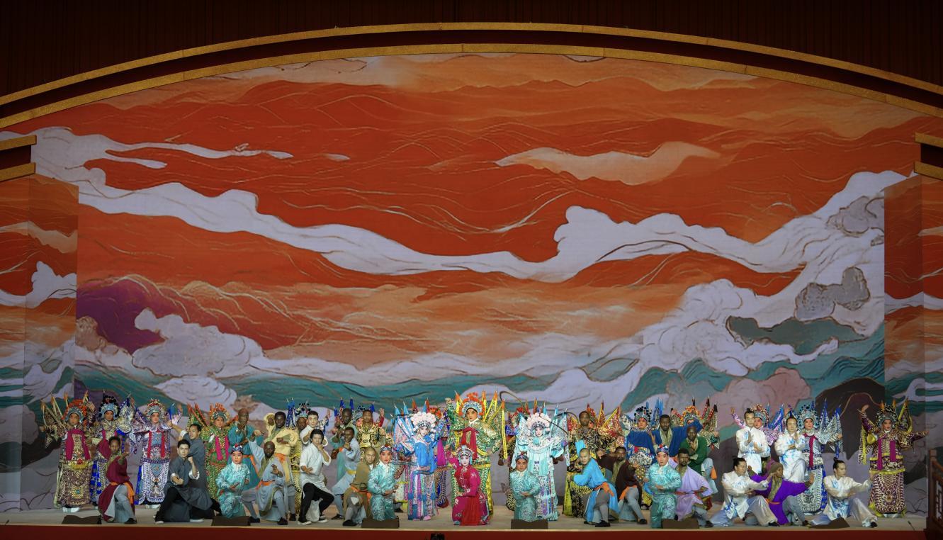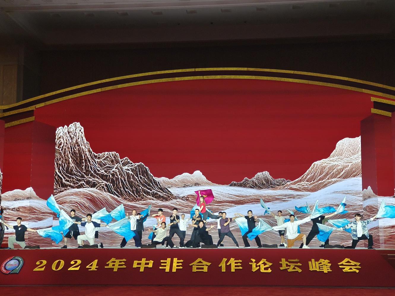 欢迎宴会上,来自湖北省十堰市武当功夫艺术团的武术队员和少林、咏春、京剧及非洲演员一起,共同表演了戏曲和武术——《群英璀璨》节目。武当太极高手以玄妙飘灵的意境、行云流水般的动作,为现场嘉宾们献上一场视觉与精神的双重盛宴。该节目融合了武当太极、传统咏春拳、少林棍和京剧等,整场演出大气磅礴,将中国优秀传统文化有机结合,多元文化交融,充分彰显了中华优秀传统文化的博大精深。