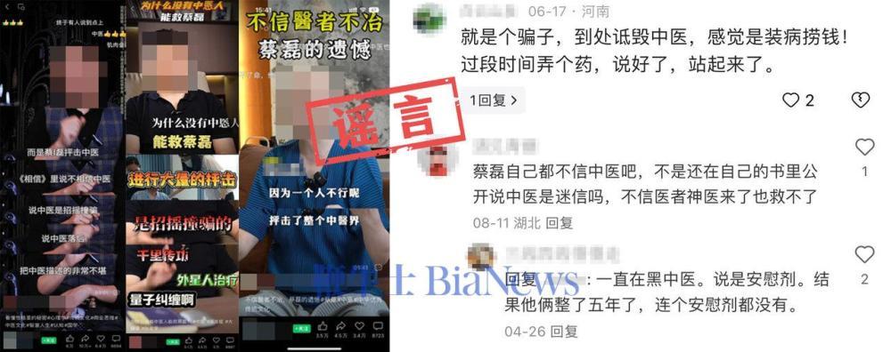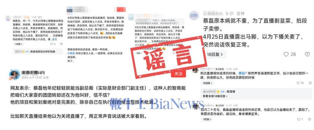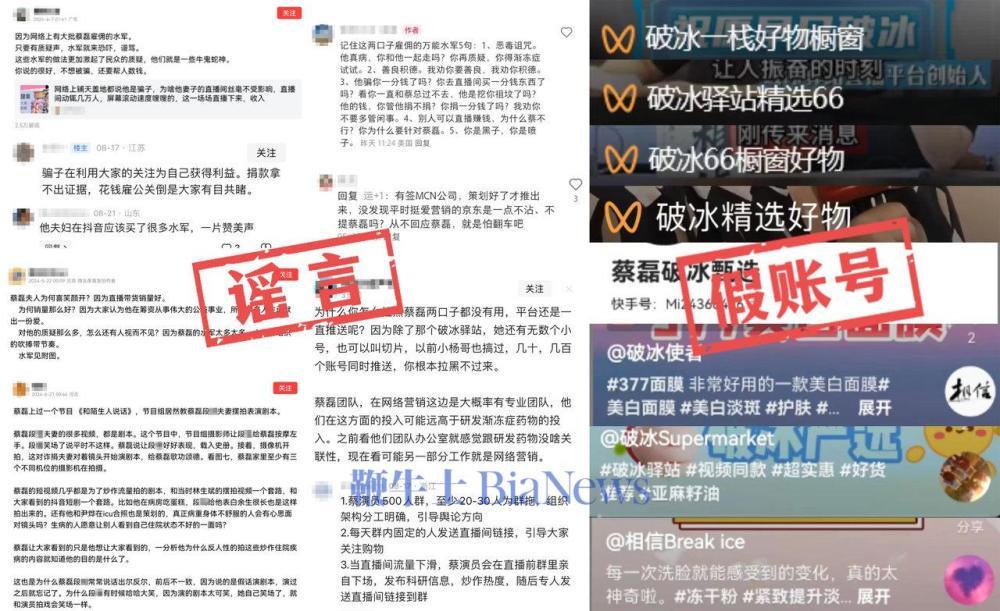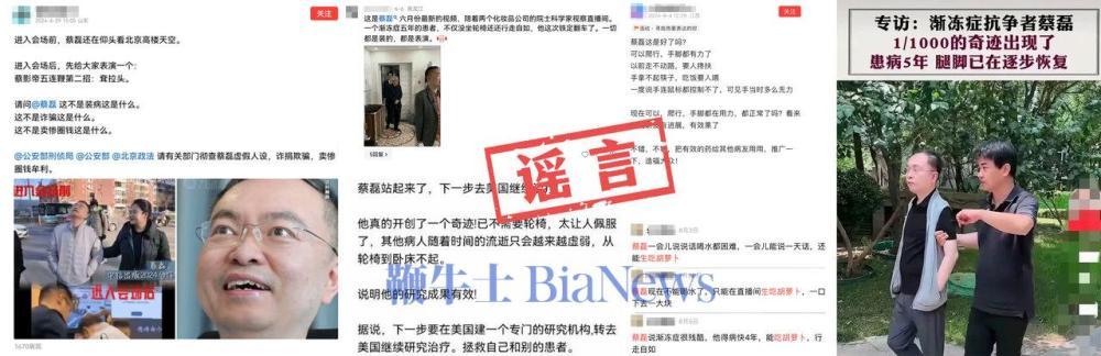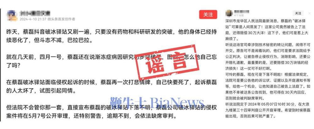 其他大量谣言更是比比皆是、触目惊心。网络上充斥大量恶意剪辑、断章取义、颠倒是非的内容,诸如“蔡磊除了上肢萎缩,其他部位已经是正常的”、“蔡磊是个声优,压着嗓子逗全网玩”、“直播间人气一下降就住ICU”、“蔡磊直播挣了好几亿”、“蔡磊利用病人试药收取高额费用牟利”、“蔡磊请水军恐吓人、骂人、威胁人”、“蔡磊与尹烨联合诈骗”、“蔡磊和施一公,两个河南老乡狼狈为奸,诈骗全社会”、“蔡磊往海外转移财产”、“蔡磊夫妻俩已经技术性离婚”、“蔡磊藐视法院公告,公司经营异常”、“钱都用在媒体推广和水军上了,都是为直播带货铺垫”等等都是胡编乱造、子虚乌有的谣言,难以逐一列举,甚至对蔡磊夫妇造黄谣、伪造京东员工及蔡磊同学身份造谣、对多个合作方及官方媒体机构造谣,对支持破冰事业的社会爱心人士与相关媒体产生的恶劣影响,对社会善意造成极大摧残。