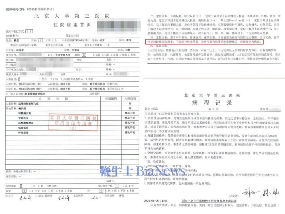 患病之后,蔡磊分别在协和医院、北医三院、天坛医院、宣武医院等相关专家的反复诊断和排查下,确诊为渐冻症(肌萎缩侧索硬化)。由于肌萎缩侧索硬化目前依然没有生物标志物的诊断黄金标准,只能通过查体、肌电图以及长期随访观察来确诊,所以在诊断上十分谨慎,避免直接对患者“判处死刑”。近期蔡磊已经公开了在宣武医院和协和医院的住院和诊断报告,六月底蔡磊又在北医三院住院做了详细检查诊断,再次被确诊肌萎缩侧索硬化,并且是全身四个区段上下运动神经元全面损害。