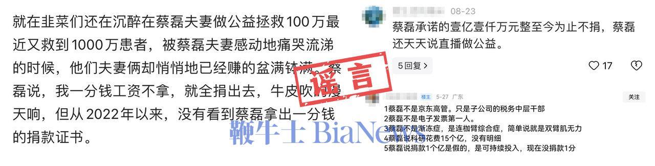 谣言十七:蔡磊为渐冻症个人投入15亿/筹款了10亿