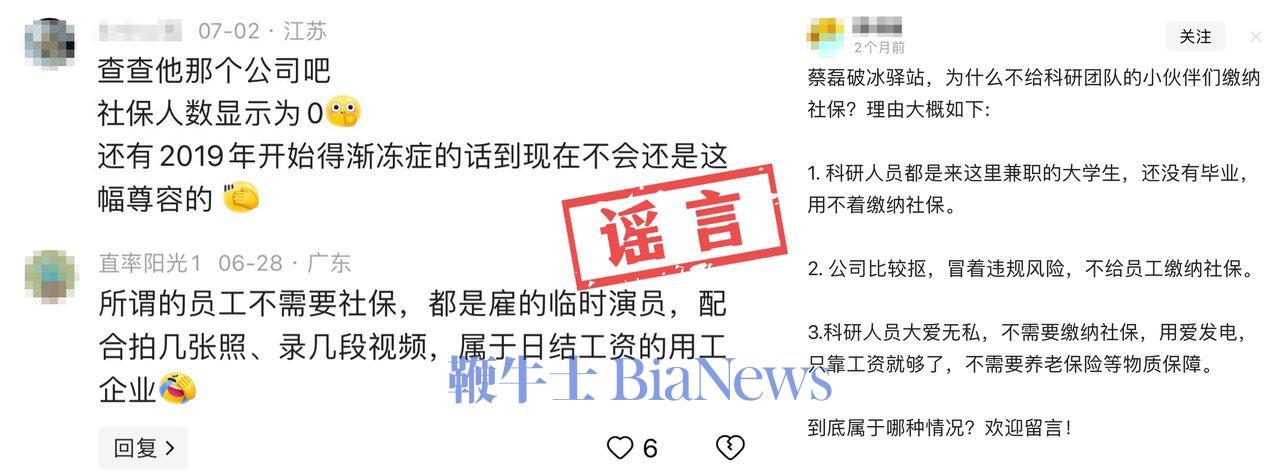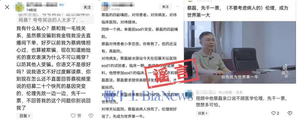此谣言截图出自腾讯新闻2022年跟拍蔡磊的纪录片《和陌生人说话》,蔡磊在北京天坛医院就中美瑞康的SOD1靶向渐冻症药物RAG-17等药物申请早日启动IIT(研究者发起的临床研究)沟通时的画面。部分自媒体账号断章取义,恶意扭曲事实,诽谤蔡磊罔顾伦理。恰恰相反,蔡磊表述的意思是渐冻症患者随时面对死亡,希望可以加快伦理审批,加速开展临床。事实上,以其中一条管线RAG-17为例,在多方的极速推动下仅在数月内就完成了伦理审批并开展IIT,中国首批基因型的渐冻症患者实现顺利入组接受治疗。目前患者反馈良好,实现了病情基本稳定,救治生命的目标可能实现,等待着进一步长期观察。
