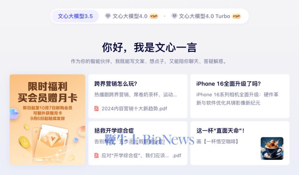 鞭牛士 9月5日消息,百度文心一言官网9月4日显示,在向全社会开放一周年之际,文心一言进行了功能最新全面升级,同时在周年期间为新老会员增加1个月专业版免费使用体验。