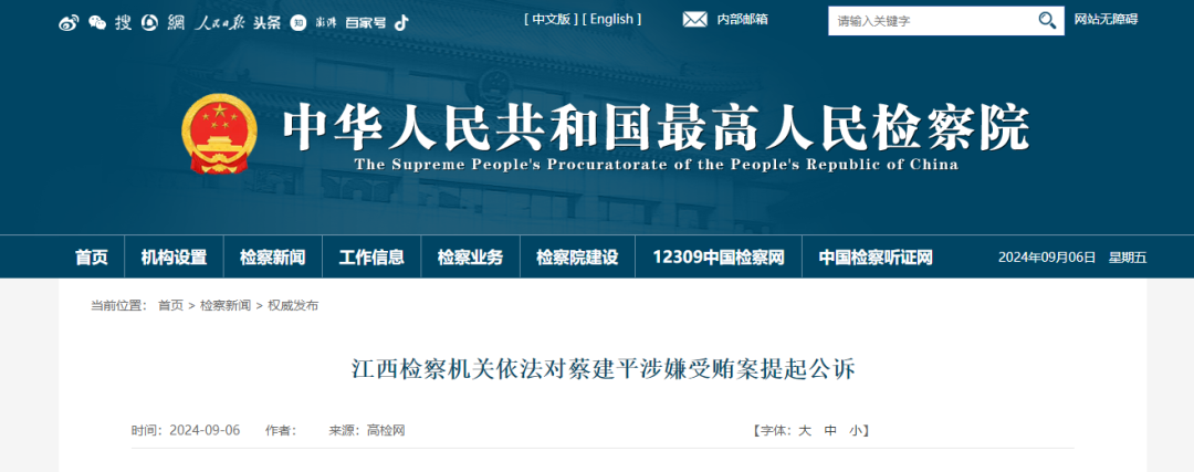 日前,江西省自然资源厅原一级巡视员蔡建平涉嫌受贿罪一案,由江西省监察委员会调查终结,移送检察机关审查起诉。经江西省人民检察院指定管辖,由宜春市人民检察院依法向宜春市中级人民法院提起公诉。案件正在进一步办理中。