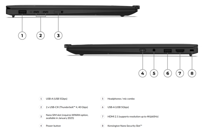 该款笔记本采用再生的碳纤维、镁和塑料组成的轻薄且环保的外观设计,获得了相关的国际环保组织认证,薄约14.37mm,轻至980g,保持经典布局的同时带来了更小的机身。其他配置方面,支持WiFi 7和蓝牙5.4,内置57Whr电池,标配65W氮化镓便携充电头,官方宣称60分钟可充80%容量。标志性小红帽配合经典三键设计及120mm加大多点触控板,还有1.5mm键程X支架和微小型键帽,键盘带背光,提供了舒适的输入体验。另外还带有侧边开机键、全尺寸指纹读取按键、支持Lenovo AI智能会议的FHR IR摄像头、高集成度键盘下扬声器支持杜比全景声/杜比语音/智能降噪。
