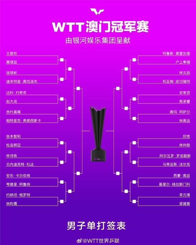 9月7日下午,WTT澳门冠军赛男单抽签结果正式出炉,中国乒乓球队共有5位球员出战,比赛时间为9月9日—9月15日。中国乒乓球队在巴黎奥运会上的主力球员、头号种子王楚钦将在首轮对阵中国香港老将黄镇廷。