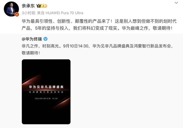 对于华为Mate XT 非凡大师,华为常务董事、终端BG董事长、智能汽车解决方案BU董事长余承东表示:“华为最具引领性、创新性、颠覆性的产品来了!这是别人想到但做不到的划时代产品,5年的坚持与投入,我们将科幻变成了现实。华为巅峰之作,敬请期待。”能够让余承东说出“将科幻变成了现实”,可见华为Mate XT 非凡大师在其心中的分量之重,同时也可以看出它将是集华为所有创新黑科技于一身的巅峰之作。
