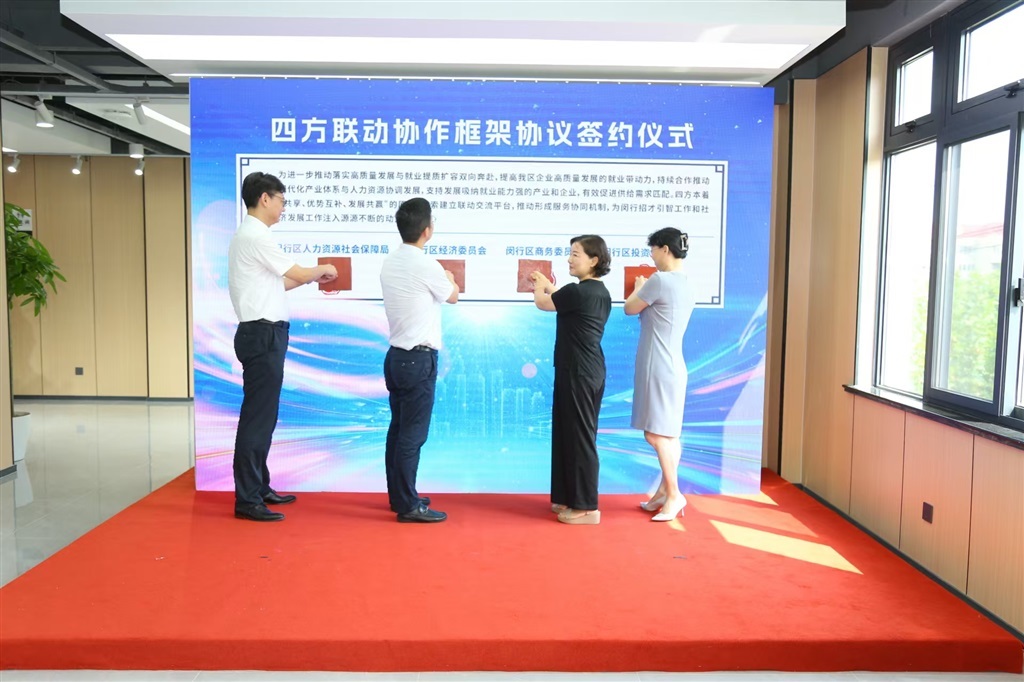 为了整合政府助企资源,引入市场惠企力量,更好地帮助企业招聘用工,当天,闵行区人社局联合闵行区经济委员会、闵行区商务委员会、闵行区投资促进中心联合签署“四方联动协作框架协议”,进一步推动落实高质量发展与就业提质扩容双向奔赴,提高全区企业高质量发展的就业带动力,支持发展吸纳就业能力强的产业和企业,有效促进供给需求匹配。