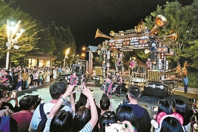 昨天傍晚,北京青年报记者在北京环球影城看到,园区已经洋溢着浓厚的“惊彩”狂欢派对气氛,小丑杰克的狂热庆典主题装饰遍布园区,瞬间点燃了狂欢派对的氛围。好莱坞大道上,小丑杰克与常思以狂欢大师的身份亮相,为游客献上了一场别开生面的狂热庆典嘉年华。其间,南瓜怪杰带领他的随从们“空降”好莱坞大道,引发游客们的阵阵欢呼和尖叫。