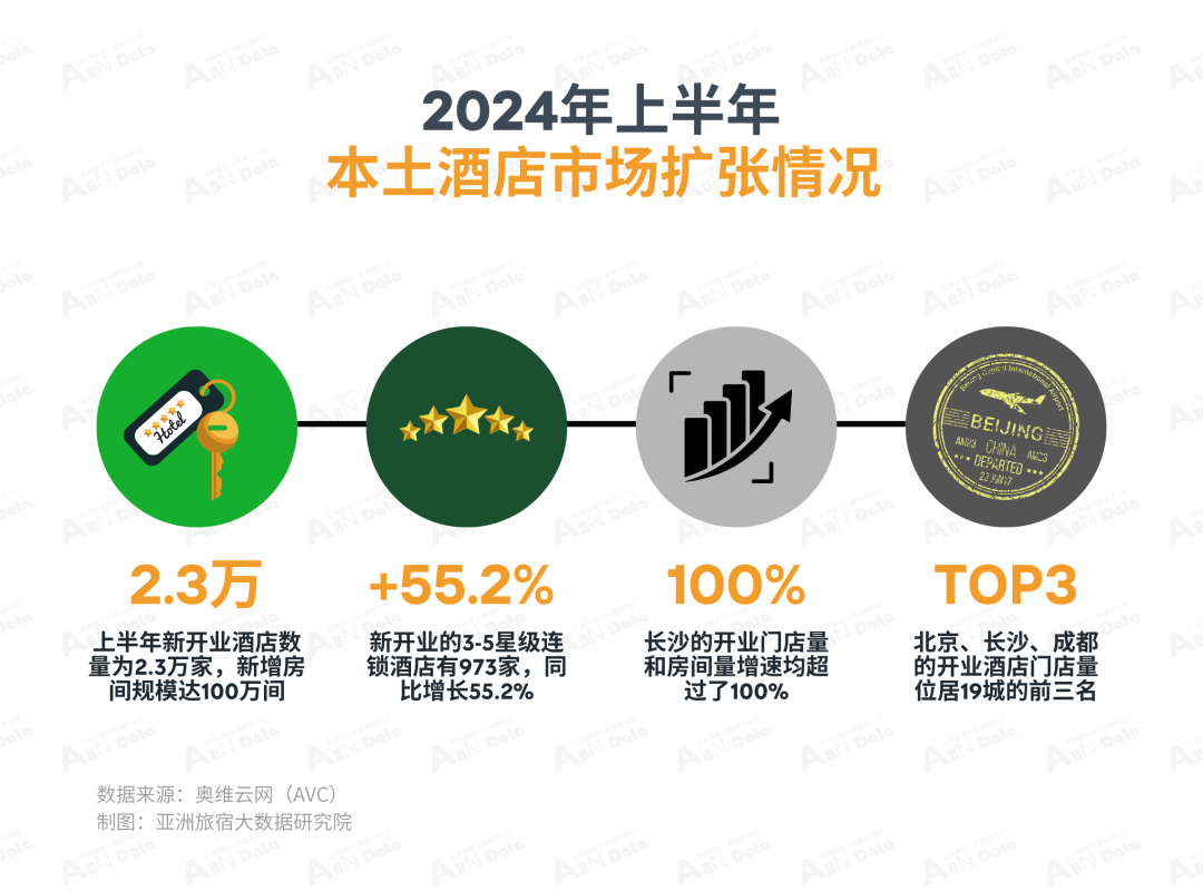 回到本土酒店市场,根据奥维云网(AVC)监测数据,2024年上半年,全国共有34万家酒店处于开业状态,总客房总数达1623万间。上半年新开业的酒店数量为2.3万家,新增房间规模达100万间。具体来看,一线和新一线城市的新开业酒店数量为5966家,其中新开业酒店房间数为27.9万间,分别占到了2024年上半年全国新开业酒店比例的26%和28%。