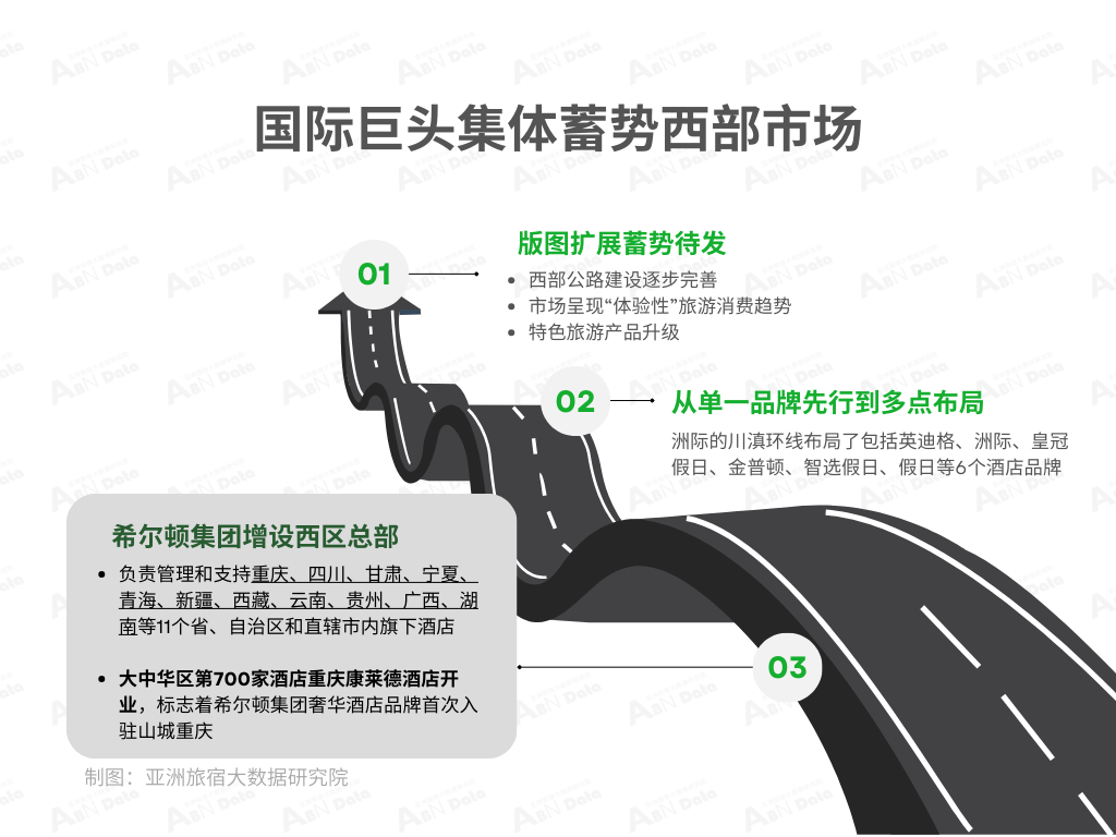 国际巨头集体蓄势西部市场 | 8月,希尔顿集团宣布在中国的运营区域划分中增设西区,负责管理和支持重庆、四川、甘肃、宁夏、青海、新疆、西藏、云南、贵州、广西、湖南等11个省、自治区和直辖市内旗下酒店。而最新数据显示,希尔顿集团大中华区约155家酒店位于西区。同时,希尔顿集团宣布其大中华区第700家酒店——重庆康莱德酒店正式开业,标志着希尔顿集团奢华酒店品牌首次入驻山城重庆。预计到2024年底,希尔顿集团在重庆市的运营酒店将达到16家,涵盖旗下所有品牌品类(奢华、生活方式、全服务和精选服务)。生活方式品牌——希尔顿格芮精选酒店预计将于今年年底前迎来在重庆的首家酒店。