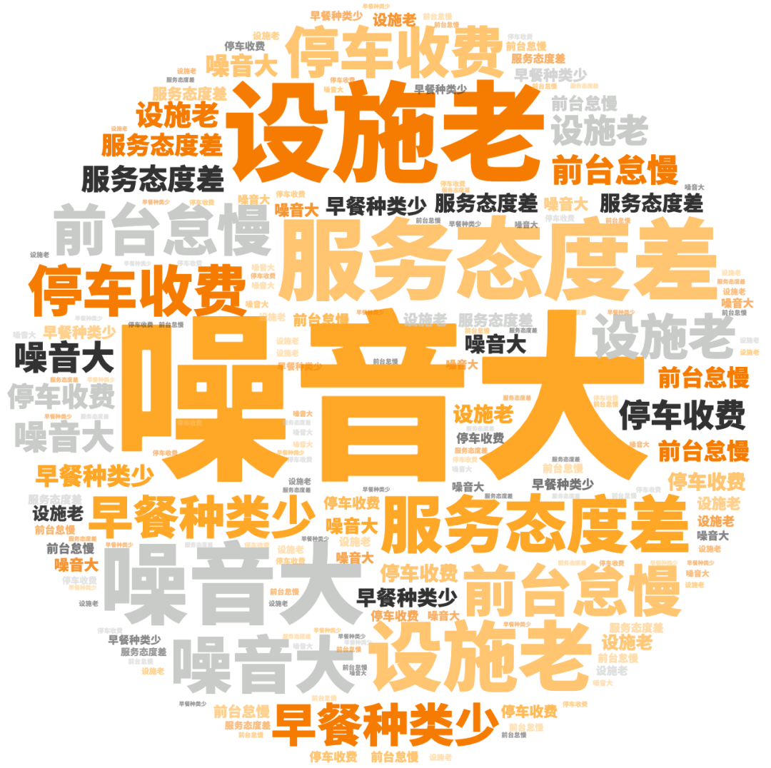 点评指数:中高端酒店点评指数平均得分达100.3,环比上月实现大幅增长,本月并未有300分品牌出现,好评维度平均是差评维度的2.2倍。好评关键词主要是中高端酒店的交通便利、设施较新、洗浴产品不错等方面。差评关键词主要集中在噪音大、服务态度差、设施老等方面。