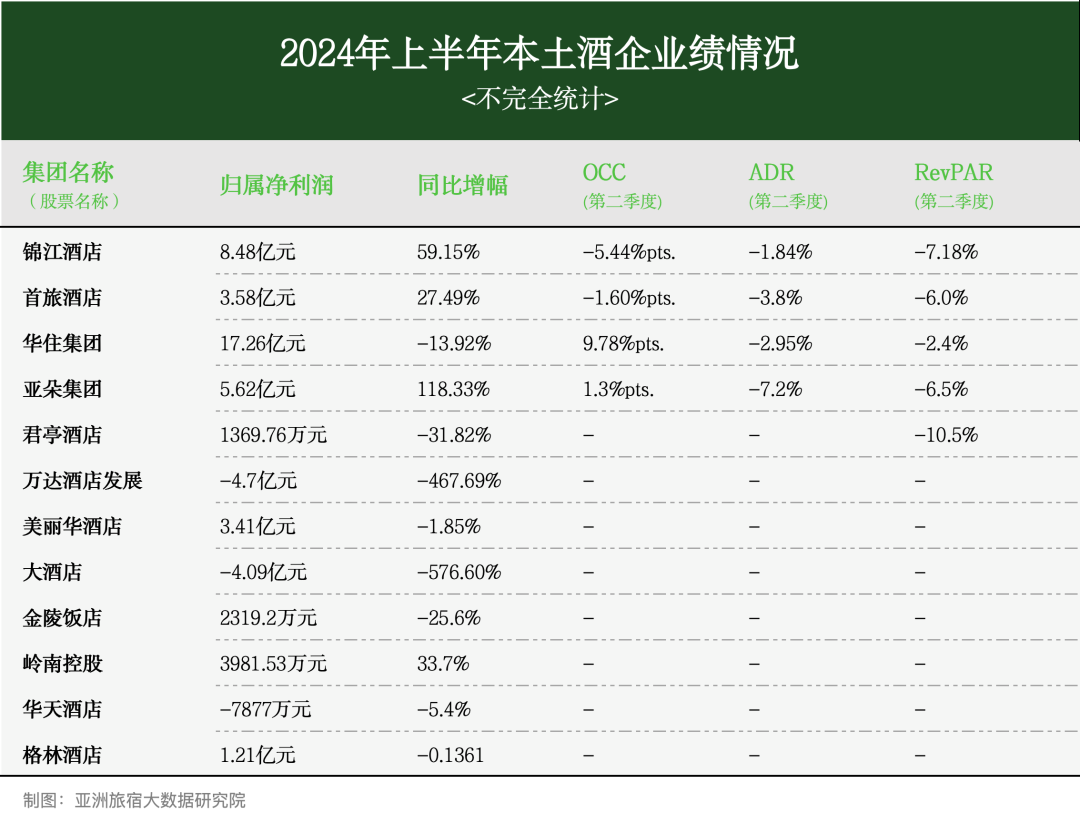 据亚洲旅宿大数据研究院(ABNData)针对12家本土连锁酒店集团的2024年上半年经营数据的监测,整体净利润均出现下滑,其中归属净利润实现正向增长的仅有4家企业。其中华住集团归母净利润最高,为17.26亿元,同比下降13.92%。增幅最高的为亚朵集团,净利润5.62亿元同比增长118.33%,其二季度零售收入从 2023 年同期的2.12 亿元,同比增长153.6%至5.37 亿元;GMV同比大幅增长157.6%,至6.2亿元。另外,万达酒店发展亏损4.7亿元,主要系出售Parcel C LLC权益所致,而主要业务在香港市场的大酒店、频繁高层出走的华天酒店也均出现大幅亏损。