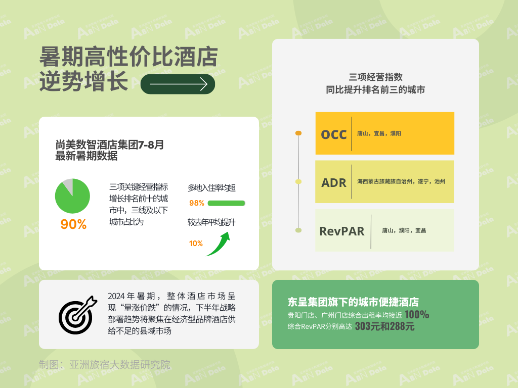 根据尚美数智酒店集团在7-8月最新暑期数据,集团旗下酒店暑期RevPAR、ADR、OCC三项关键经营指标增长排名前十的城市中,三线及以下城市占比为90%,多地入住率均超98%,较去年平均提升10%。其中入住率同比提升排名前三的城市分别为唐山,宜昌,濮阳;ADR同比提升排名前三的城市均为三线以下城市,分别为海西蒙古族藏族自治州,遂宁,池州;RevPAR同比提升前三的城市分别为唐山,濮阳及宜昌。