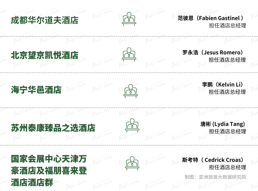 此外,本月履新较多的是国际酒店总经理,如范彼恩(Fabien Gastinel )先生担任成都华尔道夫酒店总经理,罗永浩(Jesus Romero)先生担任北京望京凯悦酒店总经理,李鹏(Kelvin Li)先生担任海宁华邑酒店的总经理,斯考特(Mr. Cedrick Croas)先生担任国家会展中心天津万豪酒店及福朋喜来登酒店酒店群总经理,唐彬 (Ms. Lydia Tang) 女士担任苏州泰康臻品之选酒店总经理。