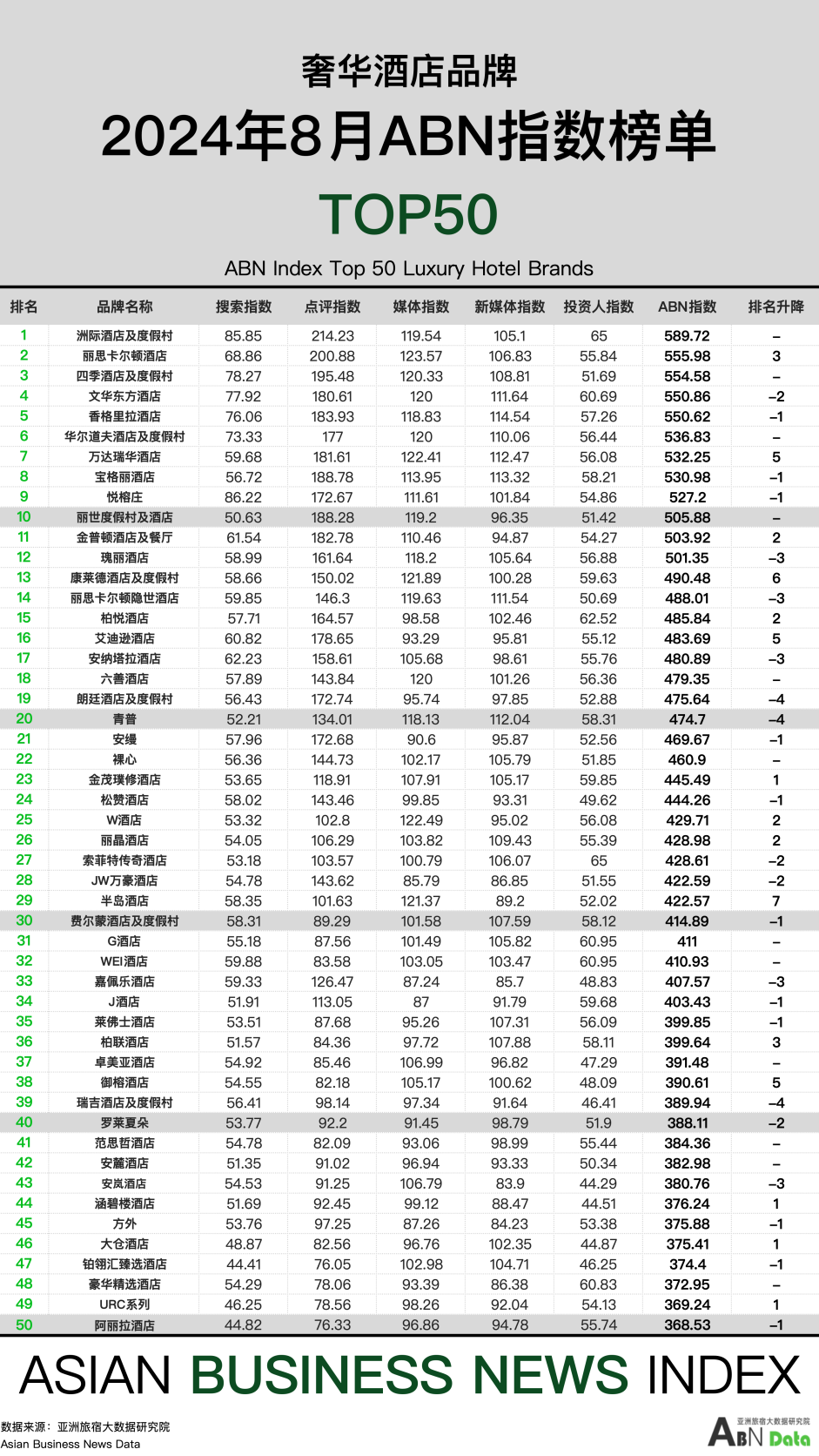 综述:2024年8月,奢华酒店的点评和媒体指数保持高位,五个指数监测综合平均得分达到448.4。