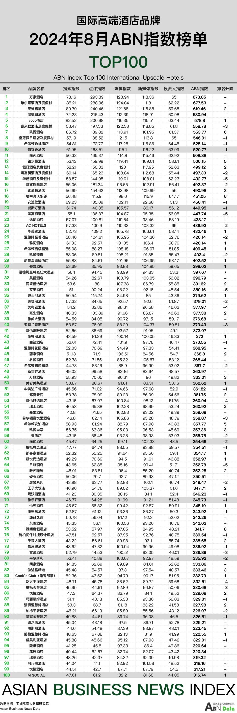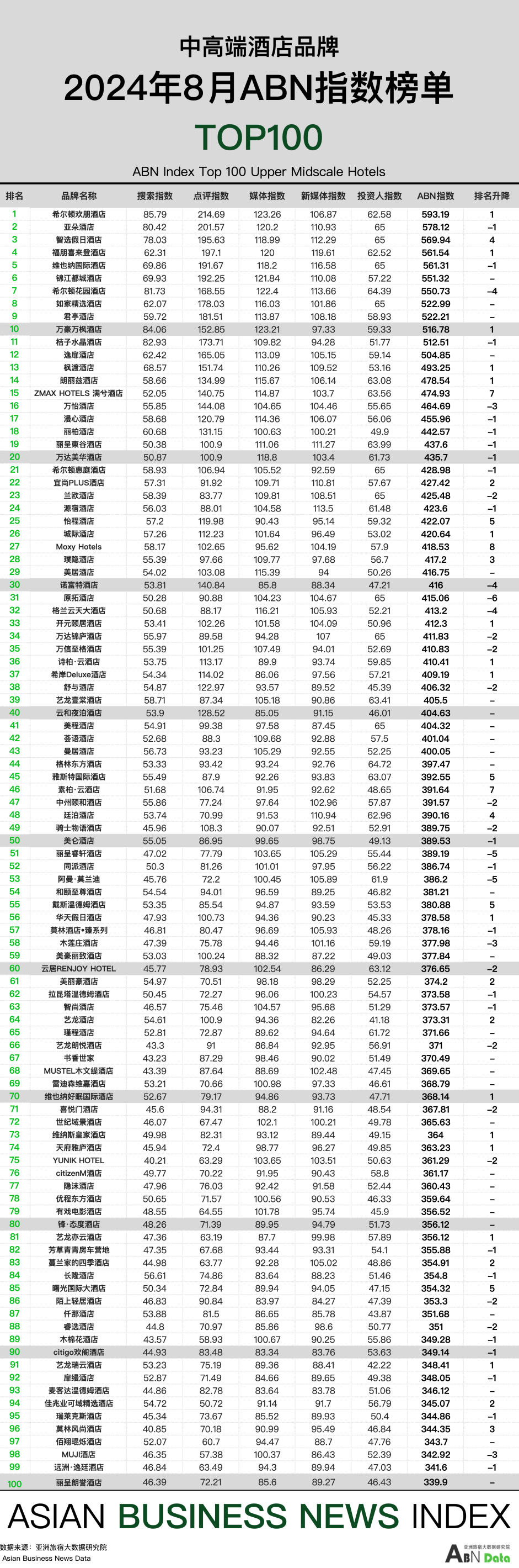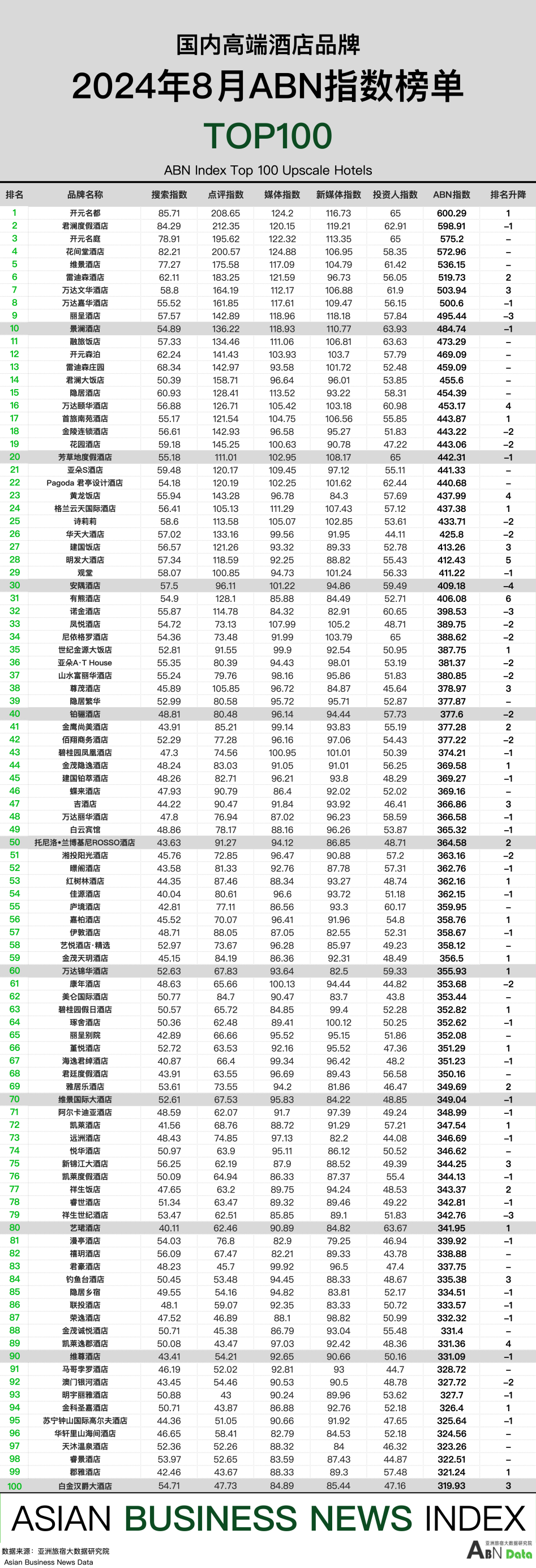 综述:2024年8月,中高端酒店的五项指数均保持高位水平,五个指数监测综合平均得分达到了406.12。