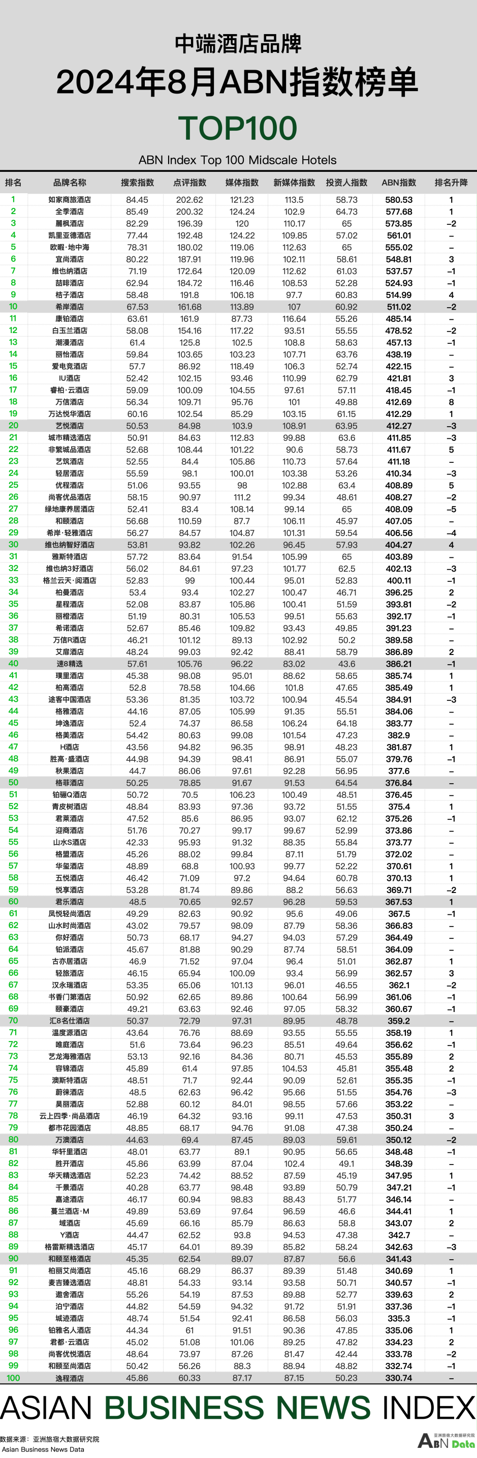 综述:8月,中端酒店的媒体和投资人指数居于高位,五个指数监测综合平均得分达到了394.06。