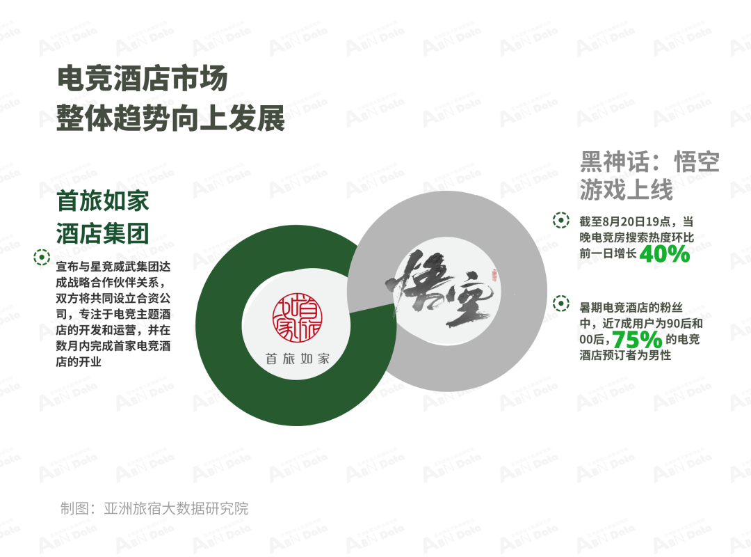电竞酒店市场趋势向上发展 | 月内,《黑神话:悟空》游戏的上线使得电竞类酒店产品需求激增。携程数据显示,截至8月20日19点,当晚电竞房搜索热度环比前一日增长40%。暑期电竞酒店的粉丝中,近7成用户为90后和00后,75%的电竞酒店预订者为男性。在该市场火爆之下,8月,首旅如家酒店集团宣布与星竞威武集团达成战略合作伙伴关系,双方将共同设立合资公司,专注于电竞主题酒店的开发和运营,并在数月内完成首家电竞酒店的开业。而在2022年3月,首旅如家也曾与互联网娱乐平台服务商杭州顺网科技公司展开战略合作,推出中端类型的YUNIK电竞酒店。