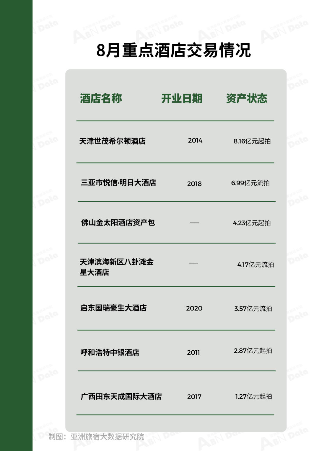 8月,ABN指数监测名录统计共有60家酒店资产处于出售、拍卖及流拍阶段,其中拍卖价格在亿元以上酒店有17家,3家酒店交易成功。重点酒店交易项目有:天津世茂希尔顿酒店拍卖,起拍价8.16亿元;三亚市悦信·明日大酒店6.99亿元流拍;佛山金太阳酒店资产包拍卖,起拍价4.23亿元;天津滨海新区八卦滩金星大酒店4.17亿元流拍;启东国瑞豪生大酒店3.57亿元流拍;呼和浩特中银酒店拍卖,起拍价2.87亿元;广西田东天成国际大酒店拍卖,起拍价1.27亿元。