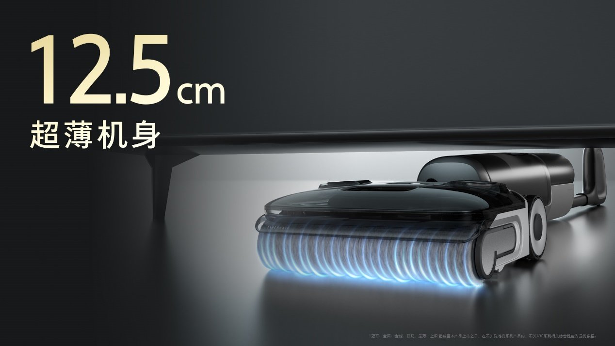 石头洗地机A30系列采用了三侧贴边的设计,配合12.5cm超薄机身和平躺不降挡等设计,能轻松清洁墙角、沙发底等卫生死角。