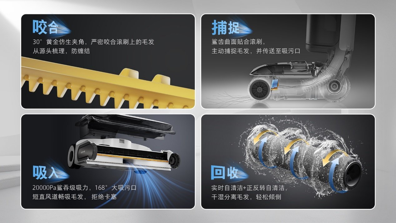石头洗地机A30系列在毛发清洁过程中通过咬合-捕捉-吸入-回收四步。机身内置30°黄金仿生夹角的双重鲨齿,能够严密咬合滚刷上的毛发,配合2000Pa鲨吞级吸力,轻松将毛发吸入,实现0缠毛效果。