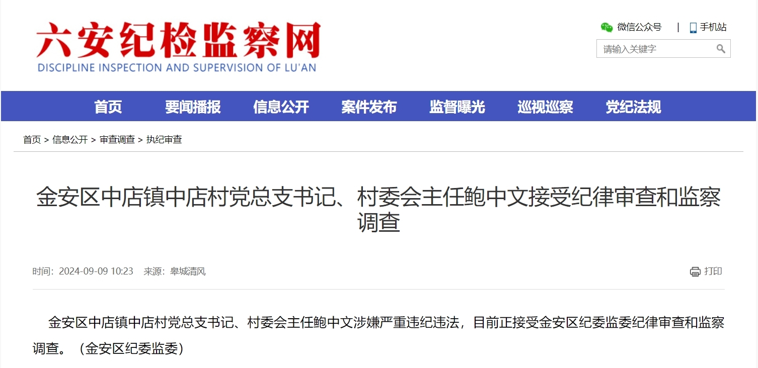 金安区中店镇中店村党总支书记、村委会主任鲍中文涉嫌严重违纪违法,目前正接受金安区纪委监委纪律审查和监察调查。(金安区纪委监委)