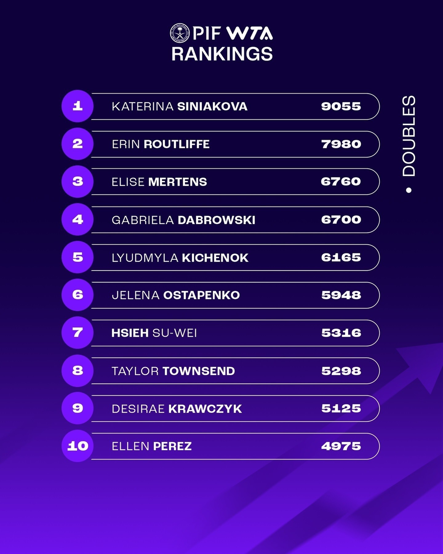 WTA女双世界排名更新,本赛季斩获法网和温网两个大满贯女双冠军的捷克名将西尼亚科娃重返世界第一。