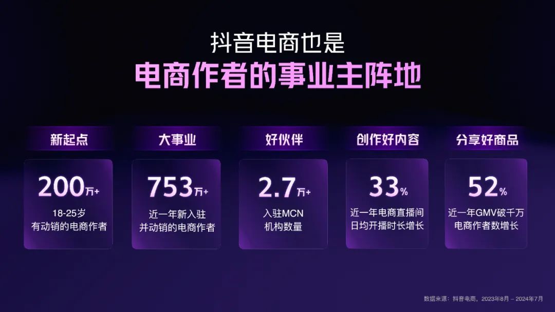 过去一年,平台上年轻电商作者超过200万个,新电商作者超过753万个,MCN机构超过2.7万家,电商直播间日均开播时长同比增长33%,GMV破千万的电商作者同比增长52%。