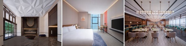 新酒店设计灵感源自古罗马神话中的水星,以灵动高效、智享悠然、奇境探索打造特色居停体验。大堂内饰的花槽纹汲取“水星逐光”理念,将速度、智慧和探索精神融入设计。一楼主墙的“星迹”艺术装置线条演变出蓬勃生命力。酒店设有160间特色客房及套房,均配备全景落地窗和智能化控制系统。位于九楼的臻选全日制餐厅提供多元中西式菜肴,一楼的大堂吧以半开放式设计风格搭配艺术灯光,为宾客提供轻松惬意时光。此外,酒店设有宴会厅、多功能会议室、高端运动空间等设施。