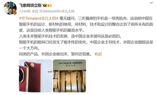 对此,通信专家项立刚发微博称:毫无疑问,华为发布三折叠屏手机是一场秀肌肉,这说明中国在智能手机的设计、新材料的使用,将材料、技术和设计的整合达到了前所未有的高度,这是目前人类智能手机的最高水平。